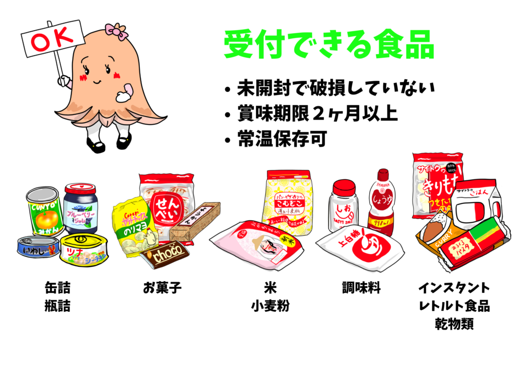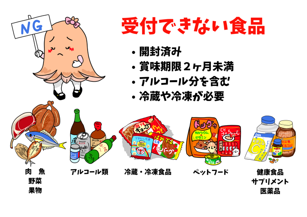 回収できる食品にはルールがございます。お持ち込みの際には、必ず以下の「受付できる食品」「受付できない食品」をご確認ください。